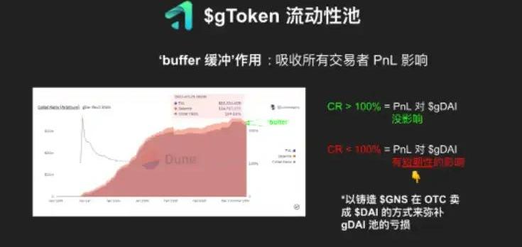 在DuneAnalytics可以看到,在它gDAI池子的下面是100%的部分,而多出來的4%這個部分就是buffer,它的balance其實是比TVL還高一些,它有什么作用呢?主要作用就是吸收交易者的盈虧帶來的影響。