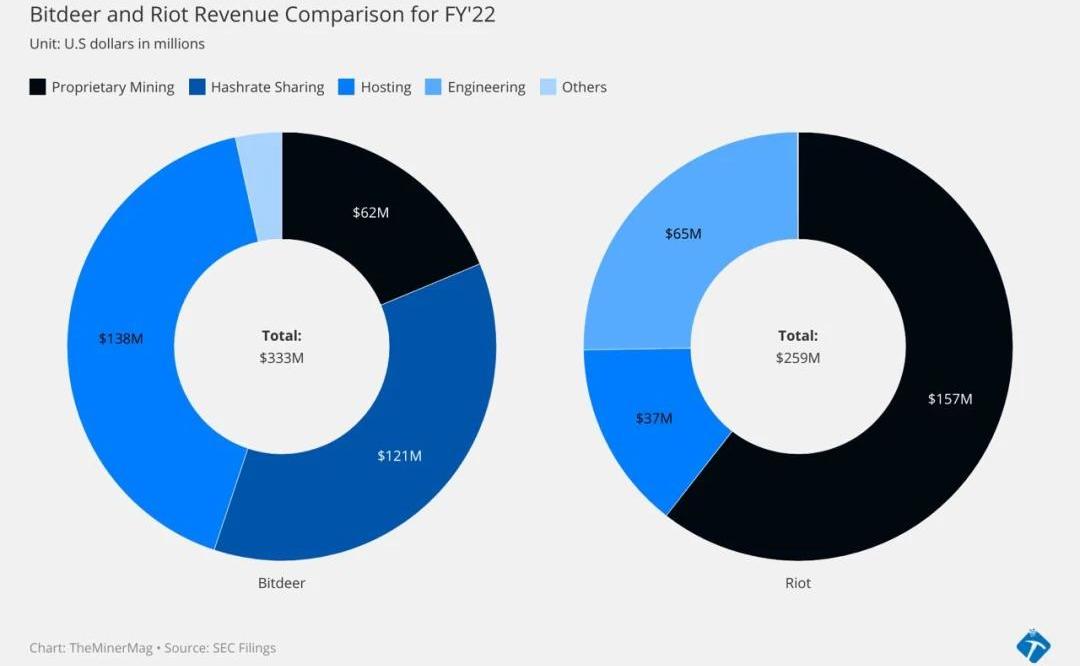 Bitdeer在截至2021年6月30日的六個月實現了1.138億美元的凈利潤,在截至2021年12月31日的一年內實現了8260萬美元的凈利潤。然而,在截至2022年6月30日的六個月內,公司出現了2520萬美元的凈虧損,全年虧損為6040萬美元。其中,截至2022年12月31日的收入比例為:自有挖礦占比18.7%,云算力占比36.4%,云托管占比3.8%,一般托管占比29.8%,會員托管占比7.8%,礦機銷售占比0.2%。相比之下,Marathon在2021凈虧損為3,710萬美元,2022年產生了6.867億元的凈虧損。其中,與挖礦設備和供應商預付款相關的減值為3.329億美元,數字資產賬面價值下降3.176億美元。而Riot在同一年的凈虧損為5.096億元,較2021年的1,540萬美元的凈虧損大幅上升。其中,比特幣挖礦收入為1.569億美元,較2021年的1.844億美元有所下降;數據中心托管收入為3,690萬美元,較2021年的2,450萬美元有所上升。損失主要體現在減值上,包括3.356億美元的商譽減值和5,550萬美元的礦機減值,這對報告的凈虧損產生了重大影響。
