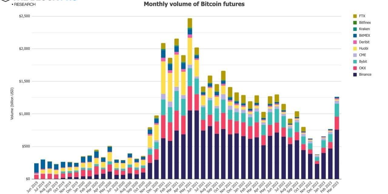 9、在加密期貨方面,三月比特幣期貨未平倉量上漲7.1%,而以太坊期貨未平倉量則出現下跌,降幅為5.8%;在期貨交易額方面,比特幣期貨月交易額在三月的漲幅約為64.7%,達到1.26萬億美元。