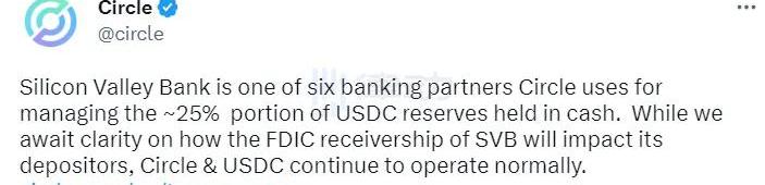 穩定幣發行商Circle今日在社交媒體上發文表示,硅谷銀行是Circle的六家銀行合作伙伴之一,負責與其他銀行共同管理USDC約25%的現金儲備。Circle目前正在等待觀察美國聯邦存款保險公司接管硅谷銀行對其儲戶的影響,但Circle和USDC繼續正常運營。