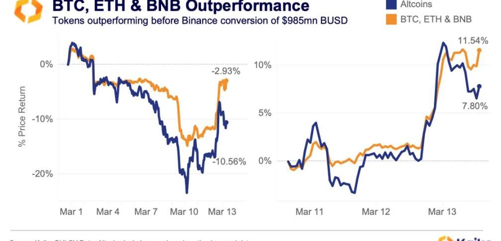 考慮到這一兌換還沒完成,BTC、ETH與BNB將有可能在短期內跑贏大盤。本月以來,這三種加密貨幣的表現優于一籃子山寨幣7.5%,盡管受到最近市場波動的影響,但僅下跌了2.9%。自3月11日市場觸底以來,這三種加密貨幣上漲11.5%,而山寨幣的回報率為7.8%。