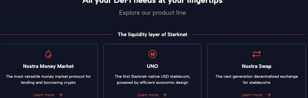 3.4.2NostraNostra是基于StarkNet部署的去中心化借貸協議,是StarkNet首款支持閃電貸的協議,也提供了StarkNet第一個原生穩定幣$UNO。Nostra旨在構建StarkNet的流動性層,由三個產品組成:Nostra貨幣市場、UNO、NostraSwap:Nostra貨幣市場:是流動性層的核心產品,為用戶提供類似MakerDAO的鑄幣借貸服務;Nostra還提供了抵押物風險隔離、智能清算等特性,讓用戶的借貸體驗進一步提升,獲得更好的資產安全性;貨幣市場還為NostraSwap和UNO鑄造者提供收益,助力整個流動性系統完成邏輯閉環NostraSwap:是Nostra系統中的穩定幣交易平臺,類似Curve,用來支持UNO的掛鉤和增長。用戶可以在NostraSwap上提供LP來獲得交易費和貨幣市場的利息,也可以實現$UNO和其他穩定幣的兌換UNO:是第一個Starknet原生穩定幣,可由用戶超額抵押進行鑄造或在NostraSwap兌換獲得;$UNO將用于各種支持場景中的使用,包括DeFi、游戲、NFT、現實世界支付等。