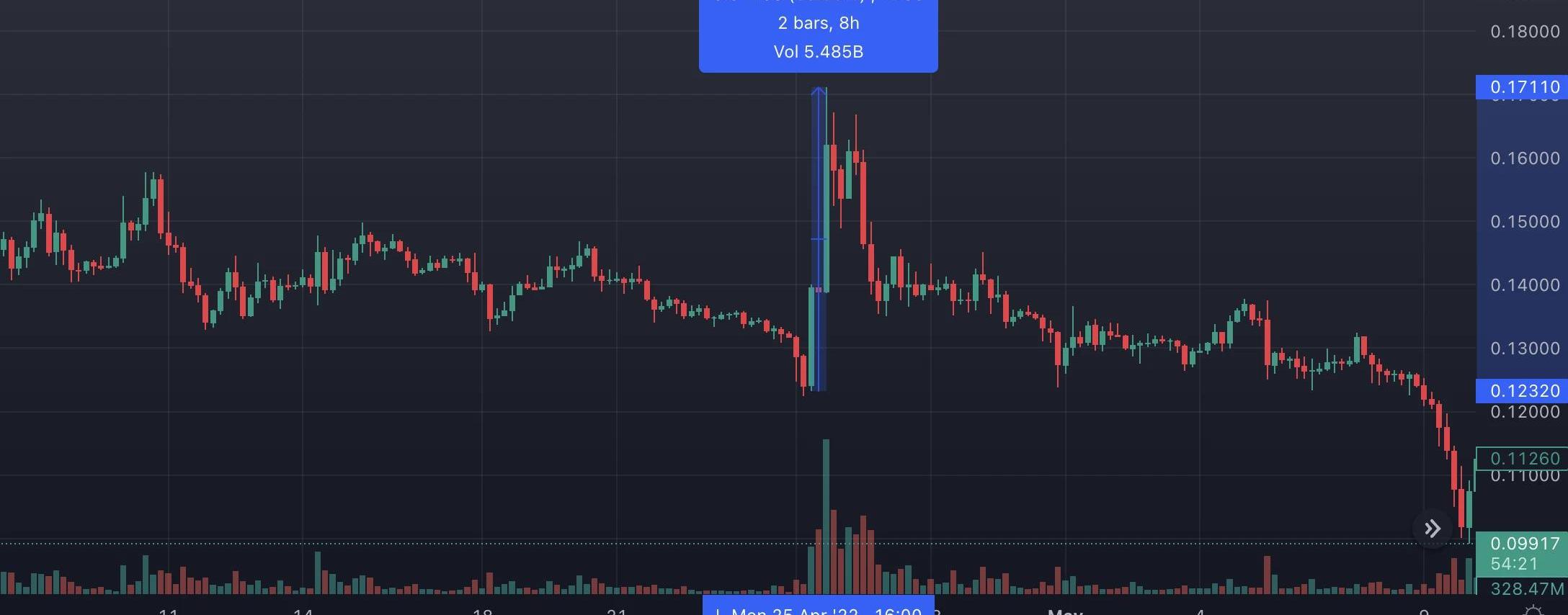 在此之前,DOGE正在持續下跌。剛剛止跌不久,馬斯克即發表了這條推特。DOGE在兩條K線內快速拉升超過20%,最終在第4條K線達到本次上漲頂點,漲幅約24%。但與前文所述的幾次上漲終結之后快速下跌有所不同,本次上漲停止之后并未遭遇快速暴跌,而是開始了較為持續的陰跌。