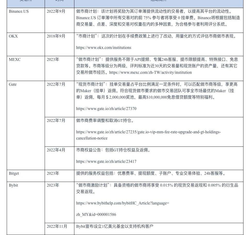 表1.各交易所的市商活動從以上活動列表能夠看出,Gate從2021年推出全球做市商計劃后,不斷有做市商大賽的活動來吸引做市團隊。同時,也在不斷調整做市費率和GT持倉。除此之外,為市商也提供一些服務,包括0息借貸額度。做市商在現貨、期貨、期權市場都會參與,而且門檻也是越來越高。相應的,交易所也會在不同的參與市場給予不同的特權。一般情況下,交易所可以在以下項目在中給予市商優惠:手續費折扣杠桿資金出入金額度API內部通道機構客戶賬戶/賬務體系對于市商來說,手續費是特別關鍵的,尤其是高頻交易過程。當然,在交易所剛成立初期,很大可能會花錢請一些市商做市,尤其是期貨、期權。2.5項目方與市商