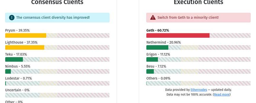 XRP/HKD-0.83%特別感謝JustinDrake的反饋和審閱一種未被充分討論但非常重要的以太坊維護其安全性和去中心化的方式是其多客戶端理念。以太坊有意沒有默認情況下每個人都運行的“參考客戶端”:相反,有一個協作管理的規范(現在是用可讀性很強但非常緩慢的Python編寫的),并且有多個團隊正在實現該規范(也稱為“客戶端”),這是用戶實際運行的。