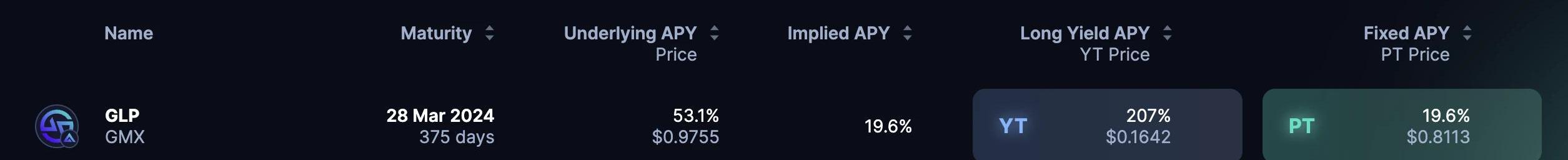 我們以GLP為例,當前GLP=$0.9755YT=$0.1642PT=$0.8113到期時間=375days也就是說這375天的GLP的收益全歸YT,而PT則可以在375天后的1:1獲取GLP假設你花1GLP買入了$0.9755/$0.8113=1.202PT。則375天后你會有1.202GLP換算為年化收益APY=1.202^(365/375)-1=19.6%就是說不論GLP接下來一年多的實際獲取了多少交易費分成,你可以拿到19.6%APY這就是PT所對應的固定利率功能假設你花1GLP買入了$0.9755/$0.1642=5.941YT375天后你的收益是多少?這完全取決于GLP的實際收益表現!所謂隱含APY(ImpliedAPY)=19.6%,就是說假設GLP接下來375天實際APY=19.6%1YT的收益為1.196^(375/365)-1=0.202GLP所以1GLP買入的5.941YT最后就變成了5.941*0.202=1.200GLP換算為APY即為1.2^365/375-1=19.6%(左側實際得出19.4%,略有誤差)假設GLP實際APY能夠在接下來375天持續保持當前53.1%的水平那么現在花1GLP買入YT,375天后將會得到5.941*(1.531^(375/365)-1)=3.261GLP換算成APY即為3.261^365/375-1=207%是的,這樣的話買YT就賺大發了那如果GLP實際APY只有10%呢5.941*(1.1^(375/365)-1)=0.611GLP是的,你買YT就要倒虧0.4GLP進去總結下來就是:SY實際利率=隱含利率,YT收益即為隱含利率SY實際利率>隱含利率,YT相當于幾倍杠桿賺了超額利率SY實際利率<隱含利率,YT相當于幾倍杠桿賠了缺口利率,甚至可能虧本金那么YT/PT的是如何定價和交易的呢?Pendle內置一個PT/SY的AMM,允許外部參與者提供流動性,用戶交易PT通過這個AMM交易即可。而交易YT則更為復雜:用戶執行使用1SY買入X個YT的交易Pendle合約即從AMM里取出(X-1)個SYPendle合并兩筆SY然后分拆XSY=XPT+XYTX個YT發送給用戶,而X個PT則歸還給AMM,由于XPT=(X-1)SY=XSY-XYT,池子總資產并不會出現變動用戶賣出YT過程就反過來了,參見下方圖片即可