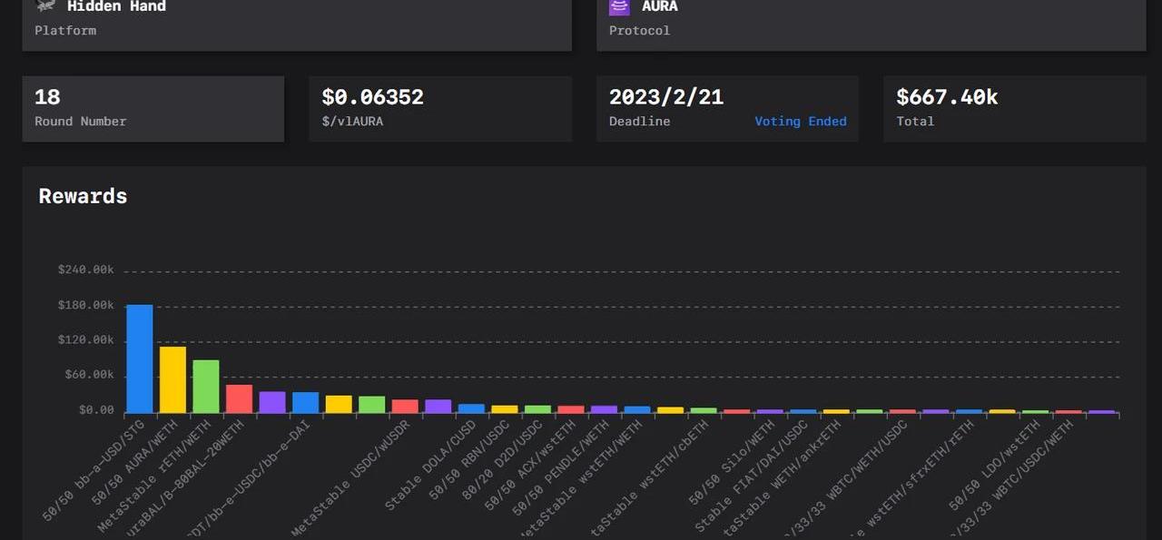 圖片來源:Curve那么,以賄選的投入296萬$來看,對于賄選購買者來說,相當于用1$可以買到14天價值854.7$的Curve流動性。我們再來看Curve在流動性市場的競爭對手Balancer的情況。根據Llama.airforce對Balancer的賄選平臺Hiddenhand的賄賂統計數據,其最近新一輪結束的賄選中,流動性采購者共支出了價值66.7萬$價值的采購費用,獲得了價值104萬$的BAL+AURA獎勵。
