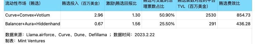 War概念項目清單,來源:https://www.defiwars.xyz/wars本文僅就交易量和TVL靠前的Balancer與Curve進行業務比較。其中Balancer與Curve一樣兼具Dex和流動性市場功能,搭建于Balancer之上的收益和治理聚合器AuraFinance則提供了賄選模塊。正如前文所說,對于流動性采購者來說,他們最看中的流動性市場要素之一就是流動性的“采購費效比”,即投入單位金額能換回的流動性價值。在其他條件相同的情況下,采購者當然希望花同樣的采購費用,能換回更多的流動性。我們知道,為了采購平臺的流動性,目前主要存在兩種方法:1.購買平臺代幣長期、持續質押后通過gauge模塊投票,可以長期投票獲得流動性;2.通過在賄選平臺支付費用,按治理周期購買一次性的流動性。方法1比較復雜,且需要考慮的預期變量太多,很難進行直接的成本比對,因此我們這里采用賄選購買流動性的方案,對Curve和Balancer的流動性采購成本進行粗略比較。對于采購者來說,這里涉及到兩個問題:1.我花一單位美元,可以買到多少價值的平臺代幣激勵?2.一單位美元價值的平臺代幣激勵,可以為我創造\\維持多少的?根據Llama.airforce的對Curve最主要的賄選平臺Votium的最近一輪賄選數據統計,該輪賄選流動性采購方共出資296萬$價值的代幣,對Convex控制的veCRV投票權進行采購。通過賄選采購,所有的流動性采購方為自己的Pool買到了彼時價值約為385萬$的CRV和CVX排放。