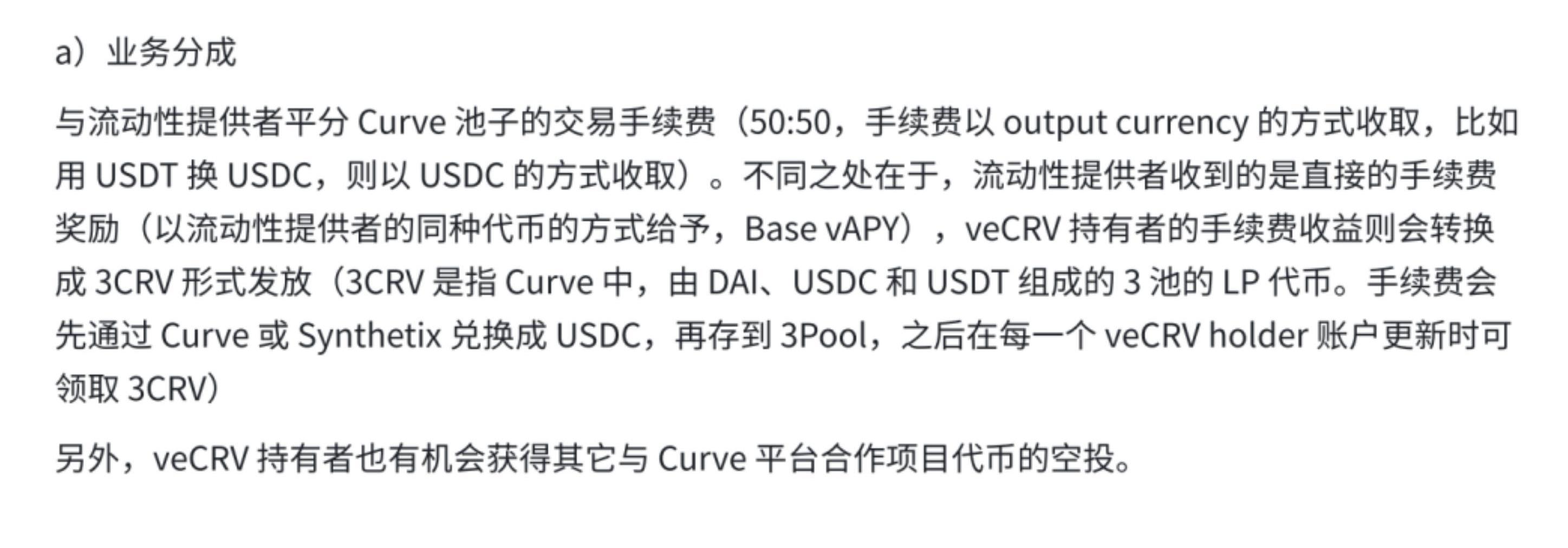 下面我們通過Curve的模型,來進一步了解ve的真實運用。Curve——ve模型的首創者Curve平臺的用戶主要會獲得兩種收益:交易費獎勵和CRV增發獎勵。交易費是Curve平臺的收益來源。平臺在互換、存儲和取出過程中收取該費用。其中,50%的交易費給予veCRV持有者,50%給予LP提供者。CRV是Curve的原生代幣,用來獎勵將LPtoken(liquidityprovidertoken,即為池子貢獻了流動性的用戶拿到的token)質押到Gauge中的流動性提供者。Gauge控制器是Curve的核心組件,由CurveDAO控制。Gauge控制器里記錄了投票治理相關的所有參數,比如“每個用戶在每個Gauge的當前斜率,以及用戶可以使用的權力和用戶投票鎖定結束的時間”等。CRV的初始供應量~12.73億,總供應量~30億,初期的日增發量~200萬。這些增發的CRV會根據Gauge控制器里的測量結果,按比例分配給將LPtoken質押到Gauge中的用戶,即Gauge中有權重的用戶。