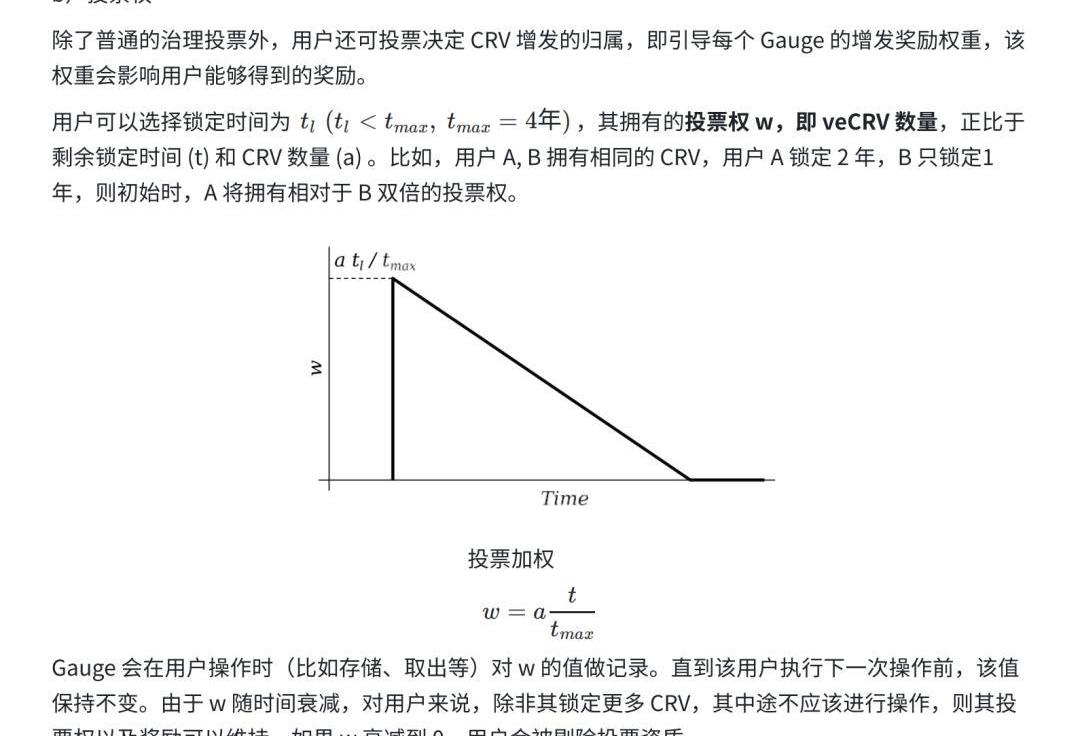 https://github.com/curvefi/curve-dao-contracts/blob/master/doc/README.md當質押用戶進一步將CRV鎖定后,可以獲得veCRV(veCRV不可轉讓,鎖定是唯一的獲取方法)。用戶可以選擇的鎖定時長在1周-4年不等。鎖定時間越久,兌換veCRV比例越高。1個CRV鎖定4年可獲得1個veCRV,鎖定1年可獲得0.25個veCRV。在鎖定期,用戶的veCRV數量會隨著剩余鎖定時間的減少而線性遞減。如果用戶分多次鎖定,則必須統一選擇到期時間。veCRV的持有者擁有Curve的治理權。為了鼓勵用戶參與治理,他們享有的部分權利是: