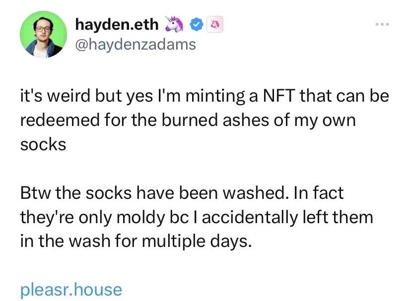 HaydenAdams隨后針對他的發霉襪子發推:“這很奇怪,但是我真的正在鑄造一個NFT,可以贖回我自己襪子燒焦的灰燼。順便說一句,襪子已經洗過了。事實上,它們只是發霉而已,因為我不小心把它們放在洗衣機里好幾天了。”在拍賣前夕,PleasrDAO開玩笑地鼓勵人們“騷擾”其他SOCKS代幣持有者,試圖刺激他們燒掉自己的代幣作為慶祝活動的一部分。Eberle說這是對加密錢包提供商Rainbow創始人MikeDemarais和其他人在Unisocks早期放出的“快到贖回的時候了,你們這些膽小鬼”的挑釁表情包的反擊,但這“主要只是為了好玩”。周三晚上,我們將看到PleasrHouse最終能否賣出足夠的NFT來燃燒虛擬SOCKS和實物Unisocks襪子。無論如何,這場運動可能會讓新一代Web3用戶轉向有影響力和高價值的Unisocks。PleasrDAO市場總監ChrisEberle認為:“盡管有這么多荒謬的解讀和惡搞表情包,但我真的認為Unisocks是DeFi和NFT發展的重要組成部分。Unisocks使用了一種‘簡單而優雅的模型’,將多種代幣和實物服裝結合在一起。它還在數字收據、兌換證明和以代幣為門檻的機制方面進行了創新,這些機制已經廣泛傳播。”他補充道:“像阿迪達斯、Gap和RTFKT這樣的大品牌都要感謝Unisocks入駐NFT這個領域。”
