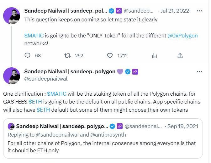 MATIC的幣價和鏈上TVL的數據表現似乎反應了PolygonzkEVM市場關注度一般。此外,有人質疑:“PolygonzkEVM出來后會不會取代PolygonPOS?”Polygon官方對此回答是“NO”,表示zkEVM不是用來取代POS側鏈的。Polygon聯合創始人MihailoBjelic也曾在一次采訪中表示,“PolygonzkEVM上線將是一個單獨運行的區塊網絡,PolygonPOS鏈將繼續作為側鏈運作。Polygon生態內將有兩個并行運行的網絡,具有不同的價值主張,即功能和權衡,開發者可根據對安全性、可擴展性和交易費用不同相應地選擇網絡。只不過,POS側鏈不如ZKRollup安全,因為ZKRollup會將其交易數據是存儲在以太坊主鏈上的,與以太坊區塊鏈繼承底層相同的安全性;POS側鏈的數據存在自己鏈上,而不是不存儲在以太坊上。”另外,MihailoBjelic也補充道,計劃PolygonPOS鏈進行一些基于ZK的增強,區塊鏈押注這種擴展技術可以推動其生態系統發展。探索如何將ZK技術集成到PolygonPOS鏈中,來提高POS鏈的安全性。不過,他也表示,如果PolygonPOS變得與ZK兼容,它只是使用像ZKRollups中的證明來確保交易不被欺騙,它依舊不將數據存儲在以太坊上,而是存儲在自己網絡上或其它鏈下的單獨網絡上。與ZKRollup不同,它不將數據存儲在以太坊上,而是在鏈下的單獨網絡上。既然,PolygonzkEVM是一條單獨的區塊網絡,也有不少用戶困惑,它還會發行單獨的代幣嗎?PolygonzkEVM在官方介紹文檔中表示,使用原生代幣ETH用于支付zkEVM鏈上GAS費用。MATIC可以用于鏈上質押治理。關于是否發行新代幣,Polygon聯創SandeepNailwal早在推特上發文表示,“有太多人詢問代幣的問題,MATIC將成為Polygon生態內的鏈上質押代幣,鏈上GAS費的默認代幣為ETH。”