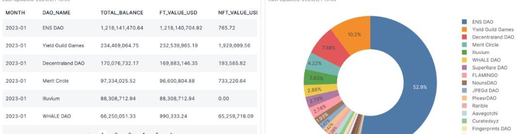 DAO組織「自下而上」的管理機制決定了其公開透明的內核及其必要性。在過去的幾年里,牛市導致DAO國庫極速膨脹,在2021年中旬增長至近350億美金,達到頂峰。由于國庫資金原生代幣資產占比常年高于80%以上,因而國庫資產總值和加密貨幣行情走勢類似。截止2023年1月底,國庫資產總值在124億美金,其中DeFi相關DAO國庫資產占據82%,NFT相關DAO國庫資產占據18%。下文我們將以此為分類從數據角度簡單剖析一下行業情況。縱觀DeFiDAO數據,2020年中旬至2021年中旬,國庫總值迅猛發展,從10億美金增長至350億美金,1年內增長超3500%。2021年中旬至2021年底,國庫總值隨著行情時有反復,維持在150億~300億之間。然而在2022年開年至中旬,DAO國庫總值持續下滑,最低觸及70億美金。2022年下旬至2023年,國庫總值有所回暖,目前DeFi相關DAO國庫總值超100億美金。雖然國庫總值受行情影響較大,但非原生代幣(Non-NativeToken)資產總值相對穩定,維持在20億美金左右。