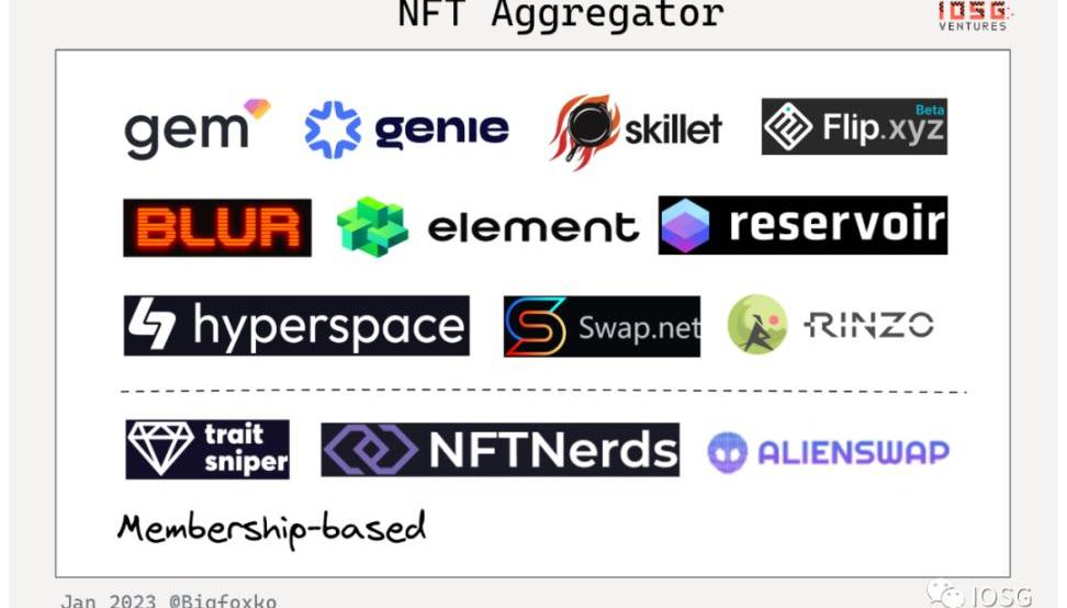 對于NFT交易聚合器(Aggregator),我們主要基于其可訪問性將分為兩類:以Blur、Gem、Genie等為代表的,面向所有用戶公開訪問的NFT聚合器以NFTNerds、TraitSniper等為代表,實行付費會員制訪問的NFT聚合器