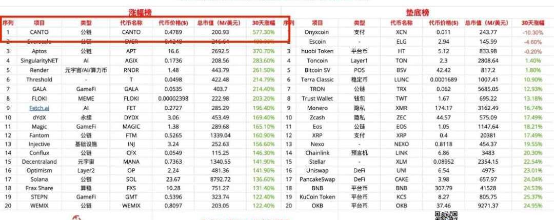 當前Canto的價格接近歷史最高峰,從一個月前的$0.07到現在的$0.42,是新年以來最閃耀的選手之一。