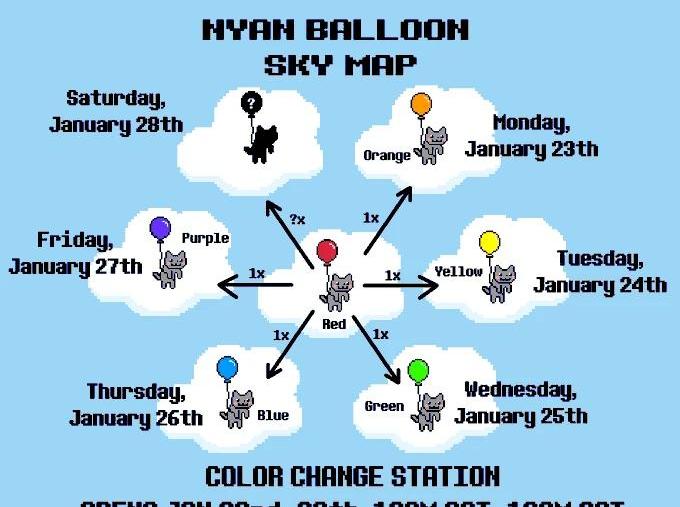 NYANBALLOONNFT的規則很簡單。所有收藏家每天都有24小時的機會將創世RedNyanBalloonNFT換成當天的氣球顏色,最后會出現一種神秘的氣球,從而激活供應燃燒。