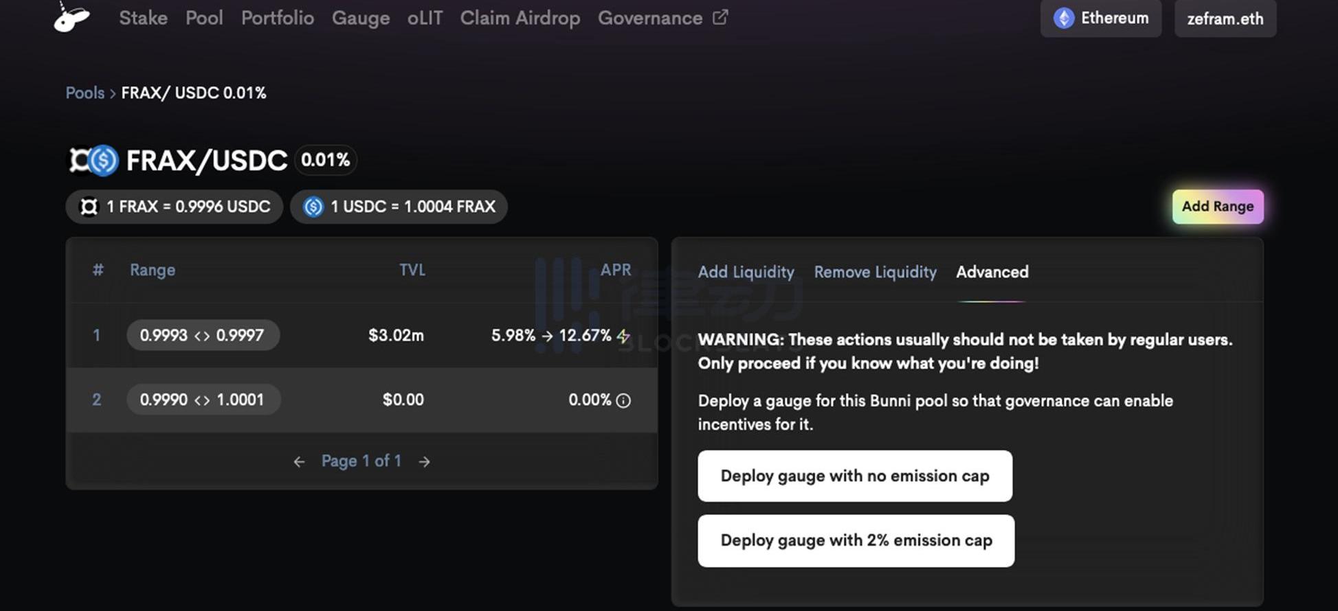 單擊要為其部署儀表的池,部署Bunni儀表無需任何許可。前往「高級」選項卡,單擊其中一個部署按鈕,并部署一個具有2%排放上限的儀表,這會更容易獲得治理投票的批準,最后,從您的錢包中提交交易。部署儀表后,veLIT持有者必須通過治理投票批準儀表,才能將oLIT激勵分配給儀表。
