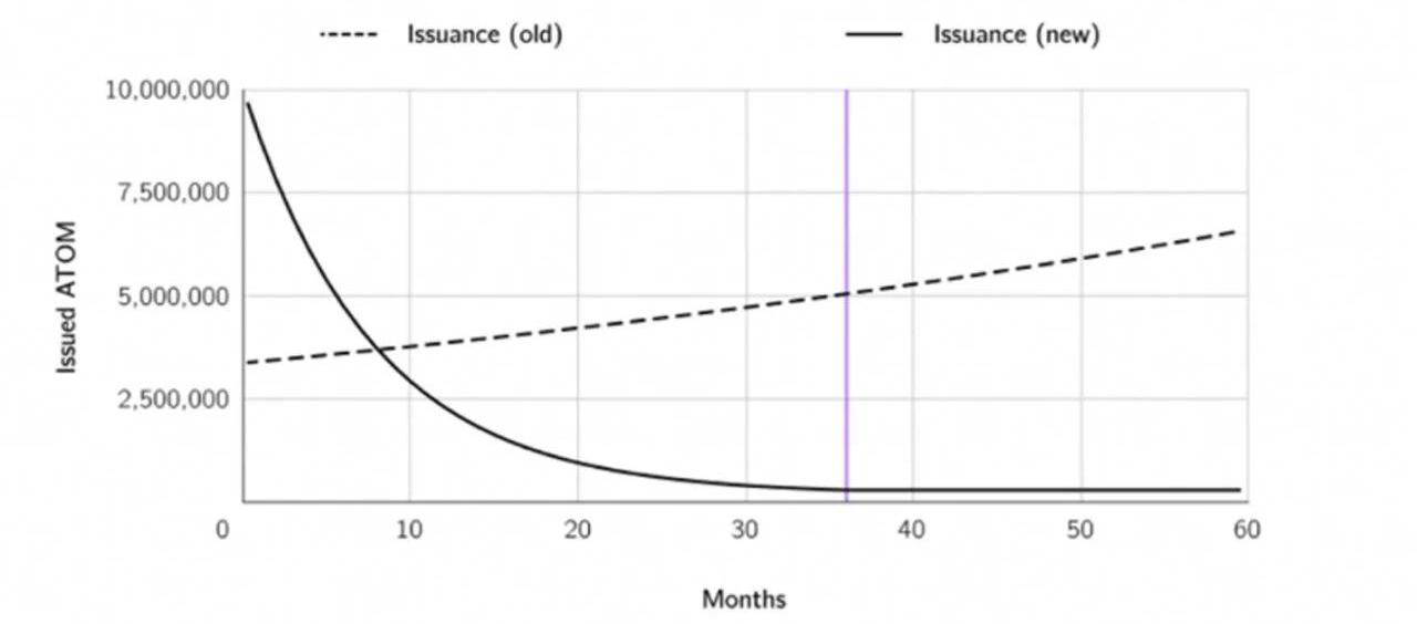 目前的Tokenomics通過質押率調節通脹發行來平衡安全性和流動性。如果$ATOM質押率低于下限閾值,則增加代幣發行,并激勵額外的抵押以提高安全性,但導致流動性下降。如果質押率超過上限閾值,發行量減少,抑制質押,改善流動性。安全性和流動性之間始終存在平衡。$ATOM的理論年化通脹率在7%-20%,而實際卻基本保持在10%以上,飽受詬病。ATOM2.0新的Tokenomics下,前9個月每月發行1000萬個$ATOM,首年鑄造超5500萬$ATOM,之后遞減,并在36個月后進入穩定甚至通縮。其初始發行期的高通脹引發社區極大爭議,擔心$ATOM持有量被稀釋,即便在CosmosHub修改2.0白皮書后改為分10批每批發行400萬個$ATOM,仍遭到Cosmos原創始人JaeKwon極力反對,其認為大部分$ATOM終將流入國庫中央委員會。