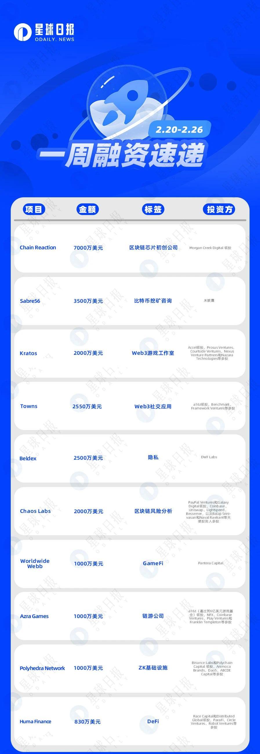 區塊鏈芯片初創公司ChainReaction完成7000萬美元融資,MorganCreekDigital領投2月23日,區塊鏈芯片初創公司ChainReaction完成7000萬美元融資,MorganCreekDigital領投。ChainReaction的聯合創始人兼首席執行官AlonWebman表示,該公司將在今年第一季度開始量產其區塊鏈芯片Electrum。該芯片旨在非常快速、高效地執行稱為“hashing”的區塊鏈操作,也可用于挖礦比特幣等數字貨幣。Sabre56完成3500萬美元融資,將建設150兆瓦挖礦托管站點2月23日,比特幣挖礦咨詢公司Sabre56完成3500萬美元融資,這些融資將用來建設托管站點。Sabre56主要從事挖礦設施建設和礦機運營業務,其目標是在今年年底前建設150兆瓦的挖礦站點,并未礦企提供托管服務。目前,總容量達到115兆瓦的兩個站點已經開始建設,分別位于懷俄明州和德克薩斯州。預計今年將完成四個站點的建設。社交應用Towns完成2550萬美元A輪融資,A16z領投2月23日,HereNotThereLabs旗下的Web3社交應用Towns完成2550萬美元融資,a16z領投,Benchmark、FrameworkVentures等參投。Towns采用了城鎮廣場的理念,將社區、NFT、游戲相結合。該產品基于以太坊區塊鏈構建。團隊表示,“團隊的愿景是創建一個數字城市廣場,讓成員可以界定邊界、制定規則,并建設他們想要的世界,只有通過去中心化和web3才能實現。”隱私技術初創公司Beldex獲DWFLabs2500萬美元投資2月24日,隱私技術初創公司Beldex完成2500萬美元融資,數字資產做市商和投資機構DWFLabs投資并與其建立合作伙伴關系。這些資金將有助于推動Beldex生態系統的研發,DWF將擔任顧問并幫助開展營銷活動。Beldex生態系統包括私人消息傳遞應用程序BChat、去中心化虛擬專用網絡BelNet、Web3瀏覽器Beldex和跨鏈隱私協議Beldex,它使跨鏈資產移動匿名化。區塊鏈安全公司ChaosLabs完成2000萬美元種子輪融資,PayPalVentures和GalaxyDigital領投2月22日,區塊鏈風險分析公司ChaosLabs周二宣布完成2000萬美元種子輪融資,PayPalVentures和GalaxyDigital領投,Coinbase、Uniswap、Lightspeed、Bessemer,以及BalajiSrinivasan和NavalRavikant等天使投資人參投。據介紹,這家成立近兩年的公司專門為DeFi交易平臺運行最壞情況的模擬。ChaosLabs創始人兼首席執行官OmerGoldberg在接受采訪時表示:“我們建立了一個Web3云,可以復制客戶運行的所有區塊鏈。我們可以與他們的應用程序進行交互,就像他們在現實中進行交互一樣。”該公司團隊成員包括前以色列特種部隊成員,其10個公開客戶包括一些DeFi領域的頭部公司,如Aave、Chainlink和Uniswap。Web3游戲工作室Kratos完成2000萬美元種子輪融資,Accel領投2月22日,印度Web3游戲工作室Kratos以1.5億美元估值完成2000萬美元種子輪融資,Accel領投,ProsusVentures、CourtsideVentures、NexusVenturePartners和NazaraTechnologies等參投。此外,還通過代幣交換收購了YieldGuildGamesDAO的子DAOIndiGG,現有的INDI代幣持有者將被交換為新的Kratos代幣,Kratos聯創表示,“新代幣將在12個月內推出”。據悉,Kratos于去年9月成立,其商業模式將游戲開發商和游戲玩家帶到其平臺上,從雙方賺取收入。作為收購IndiGG的一部分,Kratos將繼續將IndiGG品牌打造為游戲DAO。ZK初創公司PolyhedraNetwork完成1000萬美元融資,BinanceLabs和PolychainCapital領投2月22日,ZK基礎設施初創公司PolyhedraNetwork完成1000萬美元融資,BinanceLabs和PolychainCapital領投,AnimocaBrands、Dao5、ABCDECapital等參投。Polyhedra使用零知識證明技術開發了多種基礎設施產品,包括用于在Web2和Web3系統之間發送資產的ZK橋(zkBridge)解決方案、ZK去中心化身份解決方案和擴容解決方案。Polyhedra計劃與更多區塊鏈集成,并通過API和SDK工具讓開發人員更容易訪問。(TheBlock)NFT游戲WorldwideWebb獲PanteraCapital1000萬美元投資2月24日,由藝術家和游戲設計師ThomasWebb創立的NFT元宇宙游戲WorldwideWebb宣布獲得1000萬美元A輪融資,投資方為風險投資機構PanteraCapital。這是該游戲自2020年首次亮相以來的第一輪外部融資。據悉,WorldwideWebb提供完全線上、基于瀏覽器的游戲體驗,允許玩家使用以太坊錢包和NFT頭像,包括BoredApeYachtClub、CryptoPunks、Doodles、CoolCats、Deadfellaz等系列。鏈游公司AzraGames完成1000萬美元融資,a16z領投、CoinbaseVentures參投2月22日,鏈游公司AzraGames完成1000萬美元額外種子輪融資,a16z領投,NFX、CoinbaseVentures、PlayVentures和FranklinTempleton等參投,目前其融資總額達到2500萬美元。Azra計劃在今年晚些時候發布Legions&Legends的第一部作品。2022年5月消息,AzraGames宣布完成1500萬美元種子輪融資,a16z領投,NFX、CoinbaseVentures、PlayVentures和FranklinTempleton參投。籌集資金將用于推出其首款戰斗RPG游戲“ProjectArcanas”。DeFi借貸項目HumaFinance完成830萬美元融資,RaceCapital和DistributedGlobal領投2月24日,DeFi初創公司HumaFinance完成830萬美元種子輪融資,RaceCapital和DistributedGlobal領投,ParaFi、CircleVentures、RobotVentures等參投。據悉,Huma旨在構建一個收入支持的借貸協議。該協議允許基于現金流而不是代幣進行借款,可利用工資單或發票等應收款項進行借款。Huma的第一個產品是鏈上保理市場,它使個人或企業能夠抵押其未來的收入而不是現有的代幣資產進行借貸。其最初的合作伙伴包括穩定幣發行方Circle、區塊鏈支付網絡RequestNetwork和Superfluid。Web3可觀測性平臺Sentio完成640萬美元種子輪融資,LightspeedVenturePartners領投2月22日,Web3可觀測性平臺Sentio宣布完成640萬美元的種子輪融資,LightspeedVenturePartners領投,HashkeyCapital、CanonicalCrypto、EssenceV