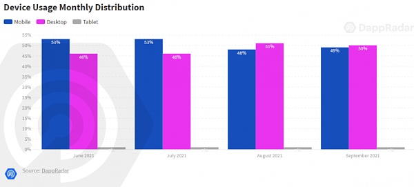 未來監控很重要的另一個方面是區塊鏈用戶與去中心化應用程序交互的方式。2021 年上半年,移動設備是連接 DappRadar 資源的首選。然而,如下圖所示,這一趨勢在 8 月份發生了逆轉,桌面設備現在是主要的交互方式。