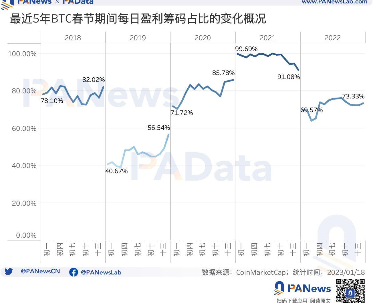 從單日的近5年日均最大振幅來看,春節期間的均值為5.14%。這一水平與PAData過往多次觀察到的BTC季度日均最大振幅接近,即“紅包行情”下,BTC的一段時間內的日均振幅與平時相當,并沒有表現是更小的振幅和更高的漲幅。其中,初四、年初十一和年初十二近5年的日均最大振幅都超過了7%,屬于單日波動較大的時間。而初一、初五和初十近5年的日均最大振幅都在5%以下,屬于單日波動較小的時間。在“紅包行情”中,處于盈利狀態的籌碼在增加嗎?這在一定程度上能表現盈利地址的相應變化。可以看到,在2018年、2019年、2020年和2022年這4年中,春節期間的盈利籌碼占比處于總體增長趨勢,但是,2018年和2022年漲幅都不太明顯,都只增加了約4個百分點,而2019年和2020年的漲幅則都很明顯,都增加了15個百分點左右。綜合來看,在初二到初四期間,盈利籌碼占比的增長都比較明顯,此后有所波動。