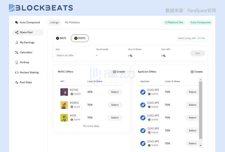 比較ParaSpace與官方HorizenLabs的質押APY這形成了一個正向循環:?$APE質押者為了能收獲更高的收益,他們會選擇在ParaSpace上質押;?BAYC/MAYC/BAKC等NFT的持有者可以即時借貸配對,組合挖礦的獎勵$cAPE可以復投到ParaSpaceApeCoinPool,產生更高的收益。如此往復,無論是$APE還是NFT的持有者,他們都能因「自動復利」在ParaSpace上享有更高的APY,同時高APY吸引更多人來質押,使得平臺配對效率更高。