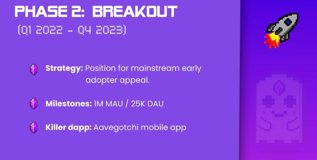 此前團隊在社區里披露了在2021年團隊有幾個關鍵的里程碑打算實現,目前均已完成或按時交付:1)將GHST列入AavePolygon借貸市場;2)計劃開發NFT的抵押借貸,即將Gotchi出租給打金的用戶,用戶無需購買NFT資產即可參與游戲,賺取收益GHST以及煉金幣將會以特定分潤比和出租人瓜分;3)推出AavegotchiAarcade——一個由社區創建的PlayToEarn迷你游戲生態系統;4)推出功能更全面的AavegotchiDAO。此外,Aavegotchi在此前也發布過項目未來三個階段的路線圖,詳情如下:第一階段