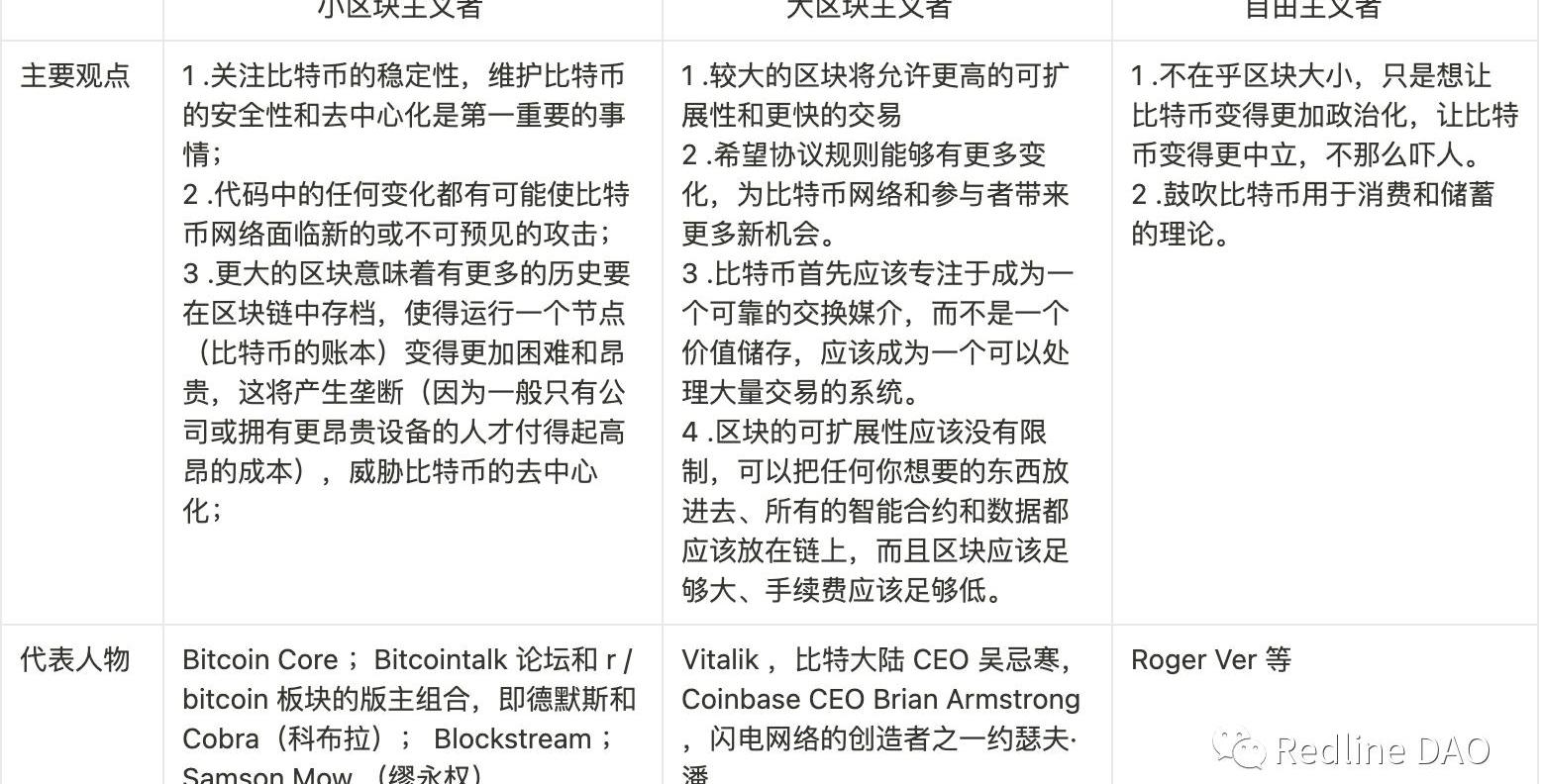 泰晤士報2009年1月3日的頭版2010年7月28日,中本聰主持了一次軟分叉,修復了OP_RETURN中的一個Bug,OP_RETURN本身是一個可用來加入最多100字節的數據的操作碼。2010年9月12日,中本聰主持了另一次軟分叉,添加了區塊體積不得超過1MB的限制,但這主要是在社區層面達成的共識;但在數據庫層面,它是無效的,因此可能會被拒絕執行,這將為之后埋下一些隱患。2010年10月4日,開發者JeffGarzik在自己開發的新客戶端里該客戶端將中本聰引入的限制移除,原因是他擔心1MB的區塊體積的限制會影響未來比特幣的交易吞吐量,但遭到了社區和中本聰本人的反對2013年3月11日,比特幣的協議在由BerkeleyDB數據塊升級成LevelDB數據庫的過程中,產生了嚴重的混亂,一些節點開始接受0.9/1MB的區塊,而那些還沒升級的節點會拒絕這些區塊。2013年5月,PeterTodd發布keepbitcoinfree.org網站,并說區塊體積限制本質是一種道德選擇,背后對應兩種價值觀:一個是給予礦工控制整個網絡的機會,從而讓比特幣中心化;另一種是希望比特幣自由、每個人都可以自主驗證。2014年10月,有關比特幣側鏈的白皮書完成了,圈內就比特幣的隱私性、速度和可擴展性的搭配產生了激烈的辯論。隨后的2015年,圍繞和比特幣區塊空間大小的可擴展性問題而引發區塊戰爭開始真正上演,在當時一系列的爭論中,我們可以將具有明顯傾向的人按照立場分為三派: