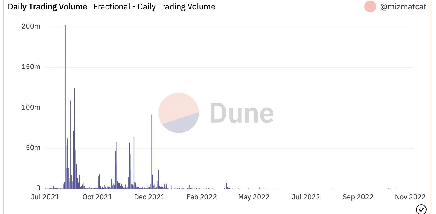 NFT金融衍生品主要分為兩類:期權合約和預測市場。a.期權合約:和傳統期權比較相似,期權發行方創建某一時間以某一履約價格買入或賣出NFT的權利并收取期權費。期權的買方通過支付權利金,在約定日期之前以履約價格買入或者賣出NFT。項目包括:NiftyOption、Putty、Hook、OpenLand等。ⅰ.同時還衍生出了永續合約項目,和FT的永續合約類似,沒有固定交割日,通過資金費用將合約價格和現貨價格錨定,期貨價格高于現貨價格一定值時,多方付費給空方;反之空方付費給多方。項目包括:NFTperp、injective。b.預測市場:一種新的玩法,通過mint、二級和租用NFT的方式進行預測和投注,例如在本次卡塔爾世界杯,你認為德國隊會贏,可以mint/二級購買/租用德國隊NFT,最終根據持有NFT的獲勝情況或者持有時間進行獎金的分配。例如RealityCards,通過持有對應NFT的持有時間來取分配獎金;而像OKX,通過世界杯每一場比賽的獲勝情況以及NFT在獎金池的占比進行分配。衍生品在傳統金融市場屬于相對成熟的類型,目前NFT的玩法基本只是換了標的資產,沒有新的突破。目前NFT衍生品還處于非常早期的階段,NFTperp還處于測試網階段,putty的交易量級也是二位數,各類型項目都處于早期階段,在NFT流動性和定金估值體系完善之前很難有爆發增長。而像預測市場類的項目反而是新鮮的玩法,是NFT帶來的新模式,如果利用好世界杯、奧運會等大的賽事,未來會一些創新的想象空間。6.碎片化