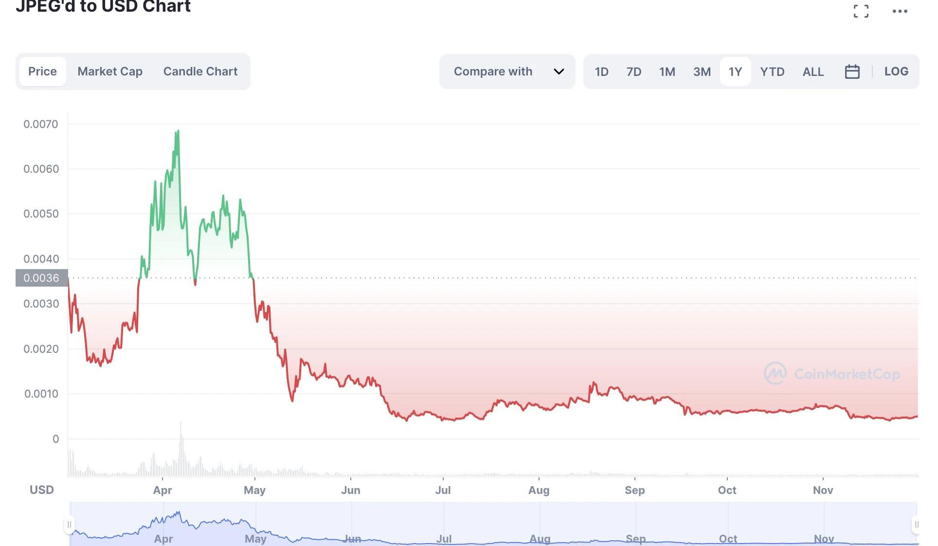 JPEG是一個治理代幣,沒有太大的經濟價值,總供應量為69,420,000,000。從Coinmarketcap上的數據可以看出,JPEG'd剛上線時有一波小高潮,后續保持平穩,約等于0.0005美元。