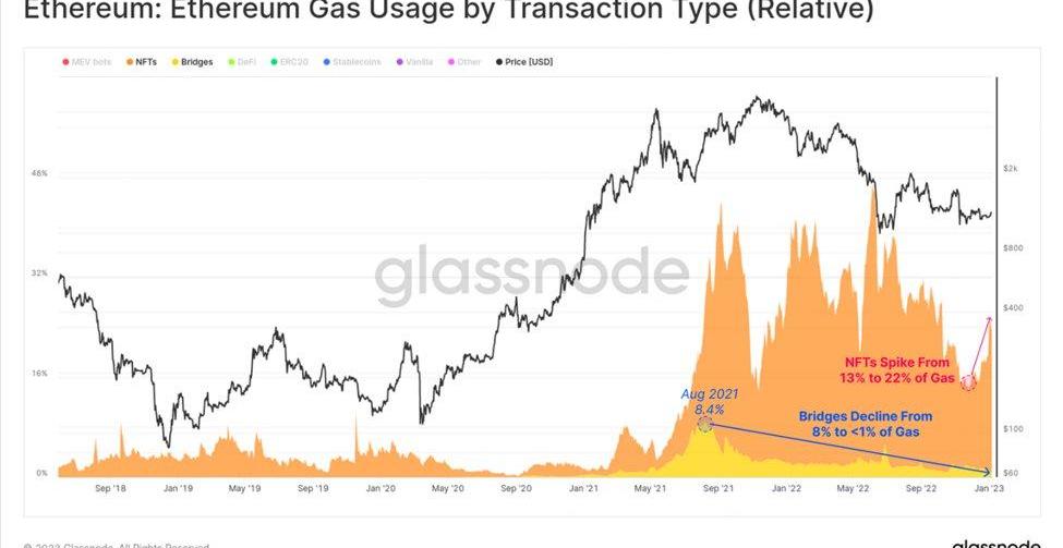 可即便如此,最近NFT交易活動復蘇成為了引領加密市場反彈的另一個催化劑。NFT活動增加導致鏈上活動增加,隨著人們對NFT的興趣重新被點燃,鏈上活動預計將會進一步增加。