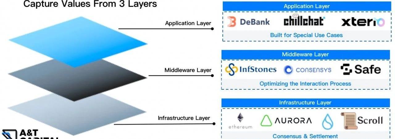 web3.0一級市場基金管理規模達500億美金;NFT市場規模超過200億,NFT持有者超300萬。在各個技術層,都能看到web3帶來的革新,應用層為用戶打造專門場景,中間層優化交互過程,基礎設施層優化共識和結算。