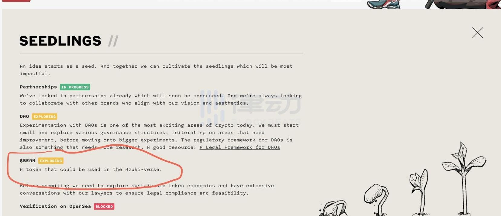 $BEANToken的內容其實很早就寫在了Azuki官網的MindMap中毫無疑問的,周年慶對于每一個NFT項目都是絕佳的營銷節點。站在這個時間點,回顧過去的一年里發生的大事件,總結項目交付的內容,同時與向社區和Holder們一起展望未來。對于Azuki,在展望未來時,「發幣」始終是一個好主題。于是從12月開始,$BEAN不斷被各個社區提起,人們看到關于$BEAN的截圖如獲珍寶,一時之間以為「『發幣』將在周年慶發生」這件事已經通過這個「證據」被坐實。然而實際上,關于它的內容在2022年早些時候就已經出現在了Azuki官網的MindMap中,并不是新內容。