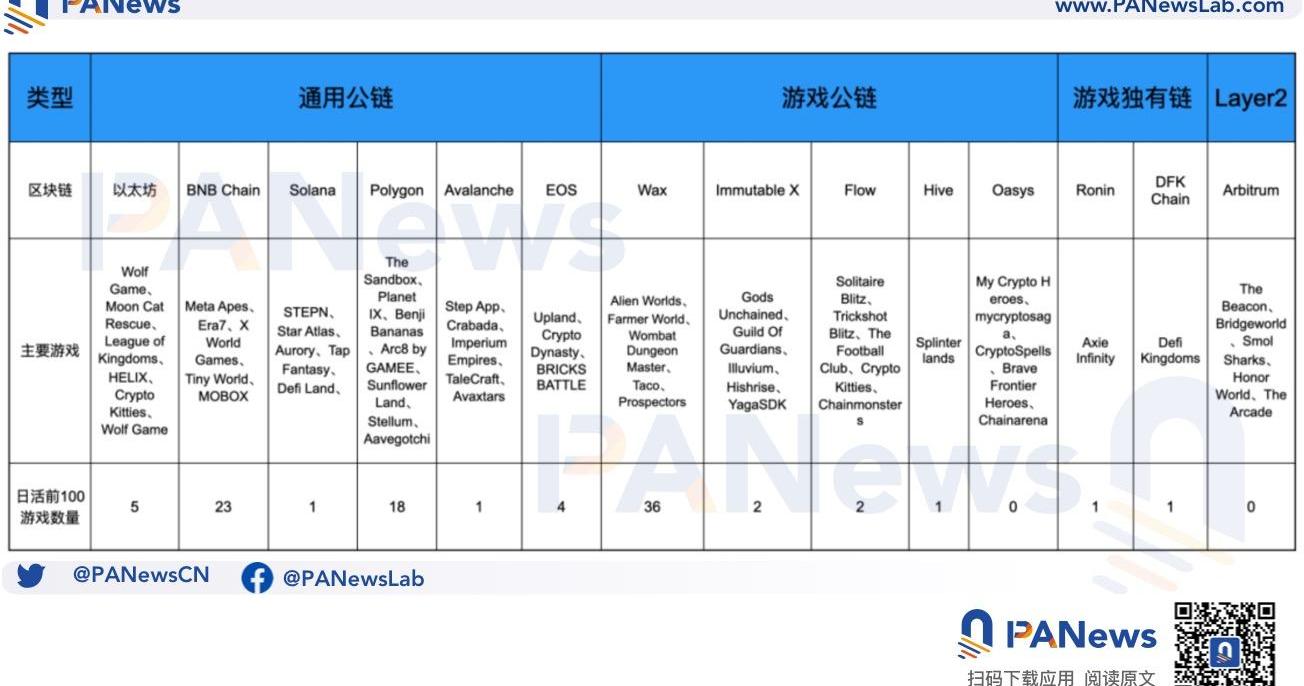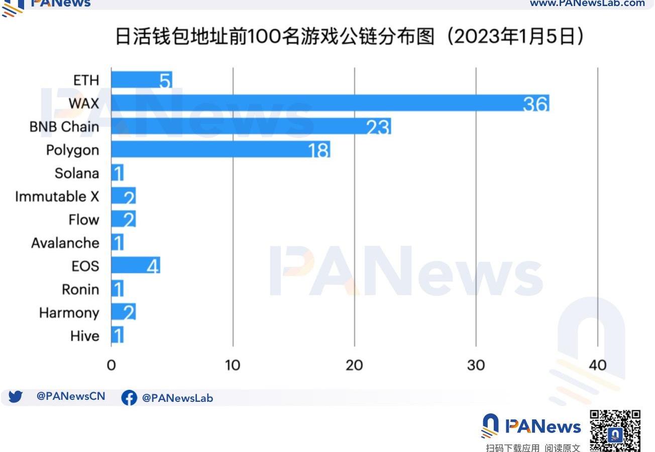 數據來源dappradar.com,PANews整理在錢包地址日活排名前100的游戲中有36個來自Wax,有23個來自幣安鏈,有18個來自Polygon,來自ETH、Solana、ImmutableX、Flow、Avalanche、Harmony等公鏈上的游戲項目均只有個位數。
