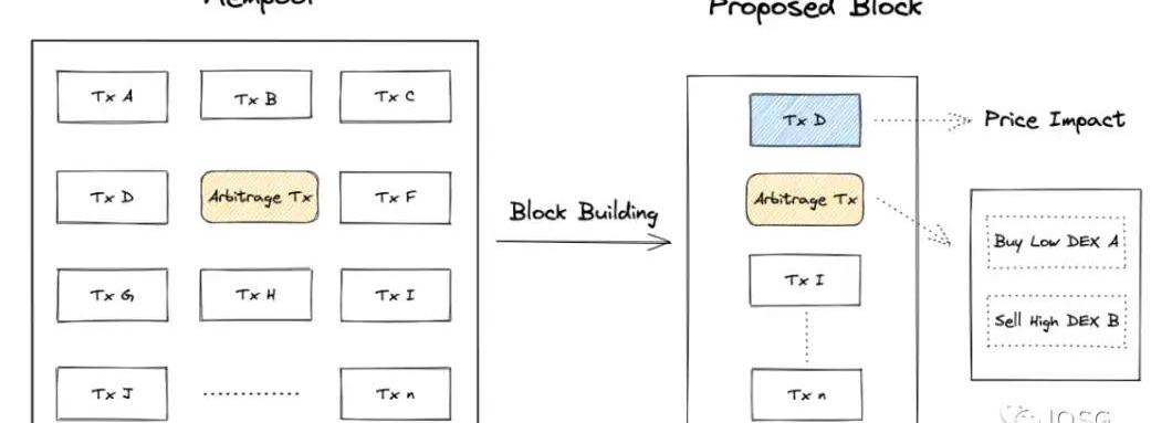 來源:Blocknative,IOSGVentures上圖基本闡釋了區塊構建的過程。Builder獲取交易的來源主要有三種:公共交易池、私密交易Channel和MEV搜索者提交的Bundles。Builder將這些交易構建成一個區塊,連同參與拍賣的出價遞交給Relay。在MEV不斷增長的趨勢下,這種Builder和Proposer作為同一實體的設計逐漸顯現出弊端:相較普通的Validator而言,大型ValidatorPool有更多機會去實現MEV;此外,他們顯然比普通Validator有更強大的MEV捕獲能力,這樣導致了嚴重的中心化問題。于是,PBS提出把Builder和Proposer的分離開來。分離之后,無論普通Validator還是大型ValidatorPool,都把區塊外包給專業的Builder進行構建,以此最大化利潤,而自己只需要做「提議」一件事情。目前的PBS分為協議層和非協議層實現,兩者的區別是前者內嵌于以太坊本身,技術上具有強制性;而后者指的是PBS是可選項,具有非強制性。協議層PBS協議層PBS將在以太坊Danksharding實施中引入,使PBS成為協議層的設計。屆時Builder除構建區塊之外,還需要在約1秒內計算32MB數據的KZG多項式承諾,并在P2P網絡中進行分發。非協議層PBSFlashbots提出了一個開源軟件MEV-Boost,作為PBS的非協議層實現。這是一個開放市場,即Builder專注于構建區塊,盡可能實現每個區塊的利益最大化。在參與拍賣后,最有利可圖的區塊被提交給Proposer。后者只需要簡單地提議這個區塊,相當于出售其區塊空間。作為回報,該區塊的Proposer可以獲得區塊構建者支付的費用。據估計運行MEV-Boost之后,驗證者的質押收入將提升超過60%。