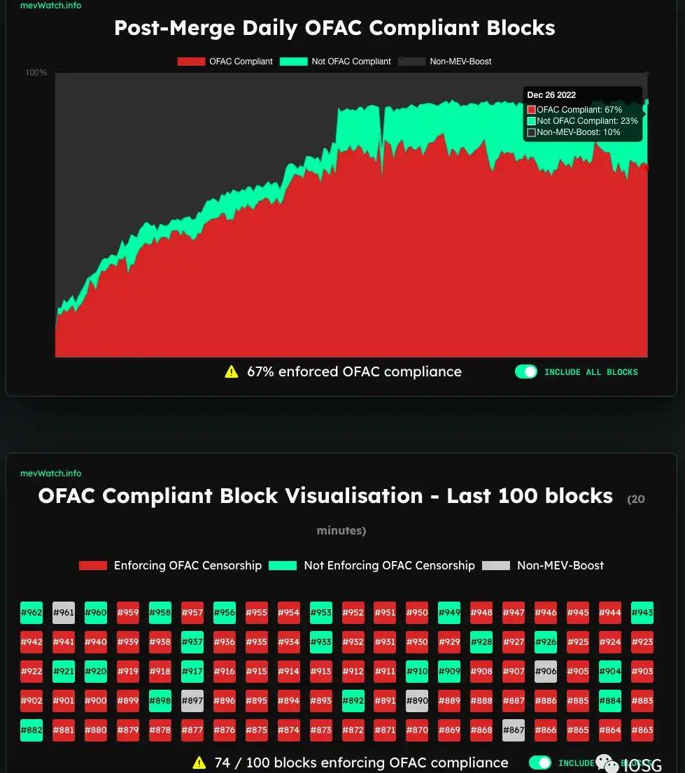 來源:mevwatch.io首先在監管層面,合并后,中心化交易平臺、質押服務提供商和實際運營商在全網Validator中占據很大比例。這些實體處在特定的法律管轄區內,因此需要權衡其業務帶來的合規風險。以太坊面臨著無形的監管壓力。從數據面上看,每日符合OFAC合規要求的區塊已經占到67%之多;每100個區塊中有74個符合OFAC合規要求。這項數據在保持高位的同時處在上升趨勢中。如果該數值接近于100%,那么受到OFAC制裁的地址發出的交易將很難被包含在區塊中。當然,迄今受OFAC制裁的地址均為黑客地址,在道德倫理上似乎有其合理性;但這個監管范圍是否會擴大,恐怕難以料想。面對監管高壓,大型驗證者池應如何在經濟利益和去中心化精神面前作選擇?與其嘗試回答這個問題,我們也許更應該從技術角度出發直接解決審查問題。除監管層面的審查之外,當前MEV-Boost中還存在著Builder的審查問題。在上述工作流程中我們看到,Proposer只能被動接收由Builder提交上來的完整區塊,無法從中包含自己想要的交易。即要么全部接收,要么完全不參與MEV-Boost。這種情況下,Builder實際上可以聯合起來有意地不包含某些交易,并對其交易發起者進行敲詐勒索。在Danksharding的協議內PBS中,引入了crList來解決審查問題,即Proposer有權利指定一個交易列表,這個交易列表必須被Builder所包含;在贏得拍賣后,Builder需要證明crList中的交易都已經被包含在內,否則該區塊將被視為無效。