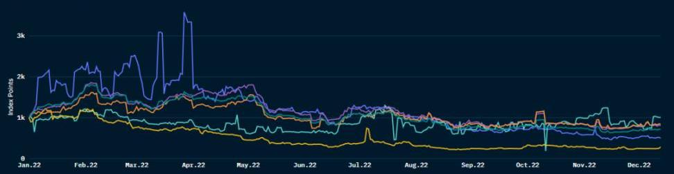 據NFTScan數據顯示,截至2022年12月14日,在以太坊上的NFT全年交易頻次達28,628,998次,活躍錢包地址數約為33,865,590個,明顯高于2020年和2021年。NFT市場也受到5月份Luna與UST崩盤事件影響,交易頻次和活躍錢包地址數于5月12日達到歷史最低點,但之后一周恢復到正常值,并于6月2日達到全年最高值,之后又開始回落至2021年初的交易水平。