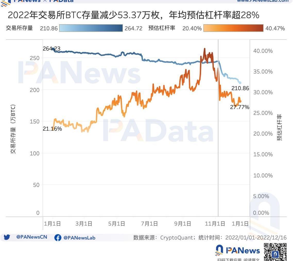2022年交易所BTC存量從264.23萬枚下跌至210.86萬枚,減少了53.37萬枚,降幅約為20.20%。其中,以FTX事件為界,以前,交易所BTC存量穩中有降;以后,交易所BTC存量快速下降。11月6日至17日這11天內共減少約24萬BTC,降幅約9.80%。且在事件基本平息后,交易所BTC存量仍然明顯下降。幣價和交易所存量變化影響著BTC市場預估杠桿率的走勢,總體而言,市場預估杠桿率在年內先持續拉升,后快速下跌的,年內最高杠桿率為10月11日創造的40.47%,但大約1個月以后的11月8日,杠桿率就回落至了28.05%。此后,杠桿率始終沒有超過30%