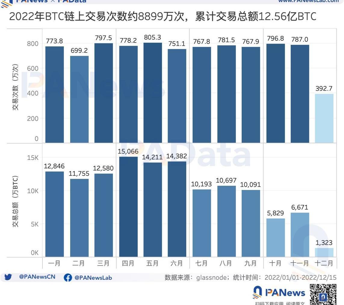 總體而言,2022年比特幣鏈上地址變化有兩大特點,一是今年比特幣的鏈上用戶數量較去年有較為明顯的下降。二是在年內市場波動較大的情況下,比特幣的鏈上用戶數量都保持了相對的穩定。除了鏈上地址變化以外,鏈上交易情況也是鏈上基本面的重要構成部分。根據統計,截至12月15日,2022年比特幣全年累計交易次數8899萬次,較去年減少了4.13%。前11個月月均累計交易次數773.3萬次,其中5月交易次數最高,突破805萬次。不過,盡管交易次數有所減少,但2022年比特幣的鏈上交易總額卻有明顯增長。截至12月15日,2022年比特幣全年累計交易總額約12.56億BTC,較去年大幅增長了36.37%。如果具體到更小的時間周期,可以看到上半年月均交易總額為1.35億BTC,明顯高于下半年的8696萬BTC。受到下半年市場大幅下挫的影響,鏈上資金活躍度也大幅降低。