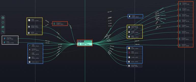 資金流向功能通過可視化的圖表清晰展現了鏈上動態,如下圖「FTX黑客」盜取資產后是如何在鏈上后續操作的,兌換成BNB等資產后又轉去了哪里。