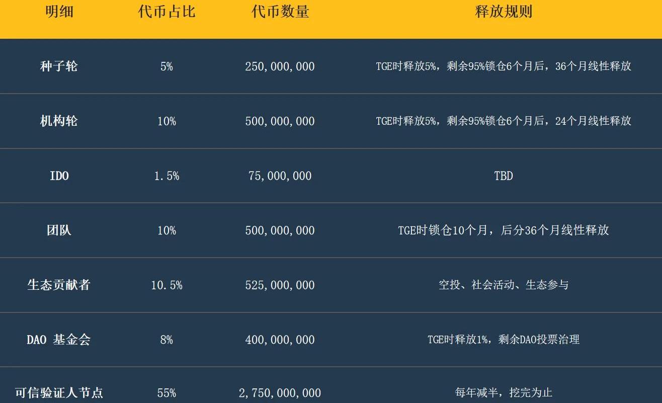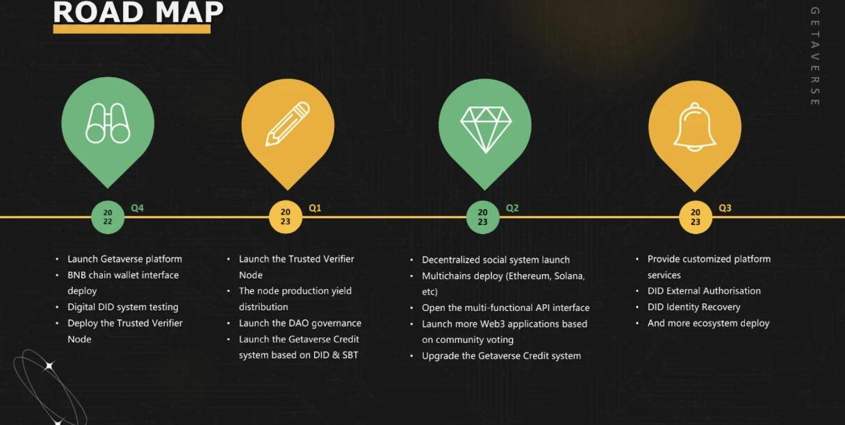Getaverse代幣GETA總供應量為50億,其分配計劃是為了激勵受托驗證人保持Getaverse的可訪問性和可持續性。GETA代幣分配情況如下:種子輪:5%機構輪:10%IDO:1.5%團隊:10%生態貢獻者:10.5%DAO基金會:8%可信驗證人節點:55%GETA代幣應用場景1.質押和治理:GETA用于GetaverseDAO的投票和治理。GETA釘子戶可以對與Getaverse生態有關的協議、方法學的變化、協議所收費用的分配等提出建議并進行投票。此外,Staker將獲得由GetaverseDAO基金支持的額外3%至15%的年利率。2.策劃數據集:每個數據集在Getaverse都會有一個收入流,策展人可以通過GETA購買和出售他們的數據集收入權。隨著收益權的價格沿著聯合曲線上升,策展人也可以選擇將收益權賣回聯合曲線,以換取GETA。這為策展人提供了一種激勵,通過使用GETA提前購買收益權來幫助識別有價值的數據集。3.支付數據消費者的索引費:旨在查詢/索引Getaverse生態數據集的dApp開發者將需要向GETA支付費用。該費用的設立是為了獎勵Getaverse館長,并且大部分GETA將被分配給擁有數據集的策展人,GetaverseDAO基金將收取其余部分。4.提高信用分數:持有GETA可以幫助用戶提高他們在Getaverse的信用分數,這可以幫助他們獲得dAppIDO、Airdrop等的優先權和配額。5.支付可信驗證人節點費用。可信驗證器節點不僅產出GETA,而且還消耗GETA,需要支付GETA作為節點操作費。6.GETA代幣上線后,用戶可以根據GETA代幣價格使用GETA購買節點,且這些購買節點的GETA代幣將進行永久銷毀,不再流通于市場。Getaverse路線圖