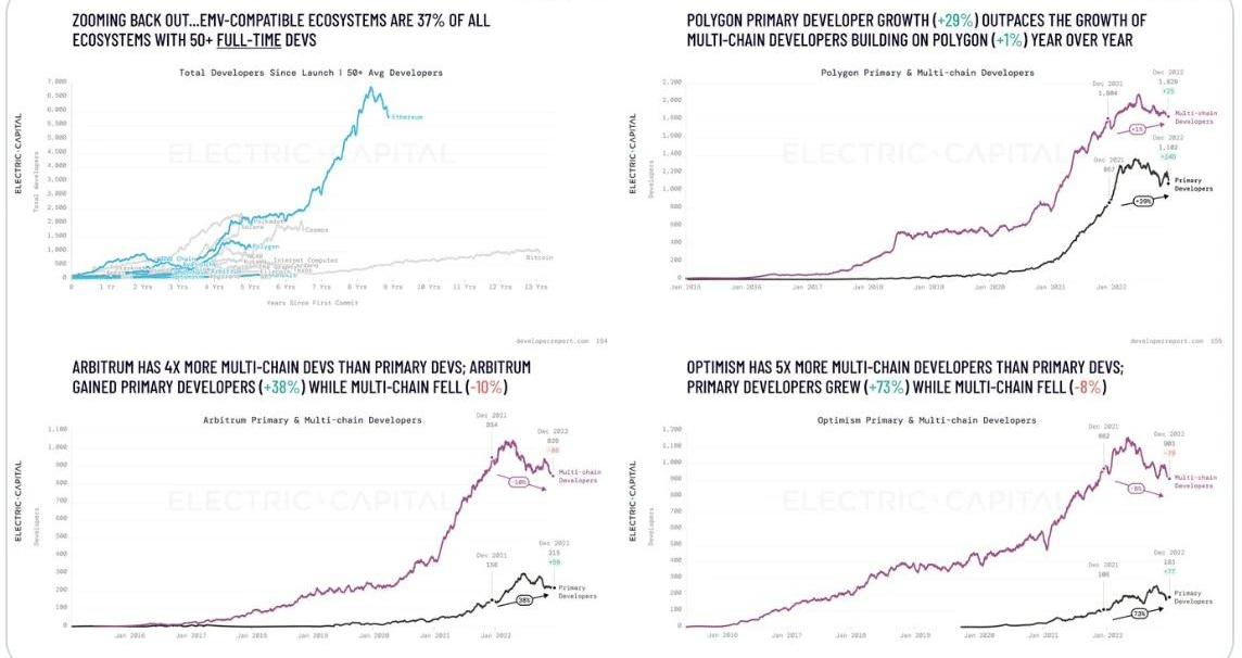 37%的生態系統中有50多名全職開發人員與EVM兼容。越來越多的開發者不止一條鏈上部署。Polkadot、Avalanche、BNBChain、Celo、Arbitrum、Optimism有更多的多鏈開發者。