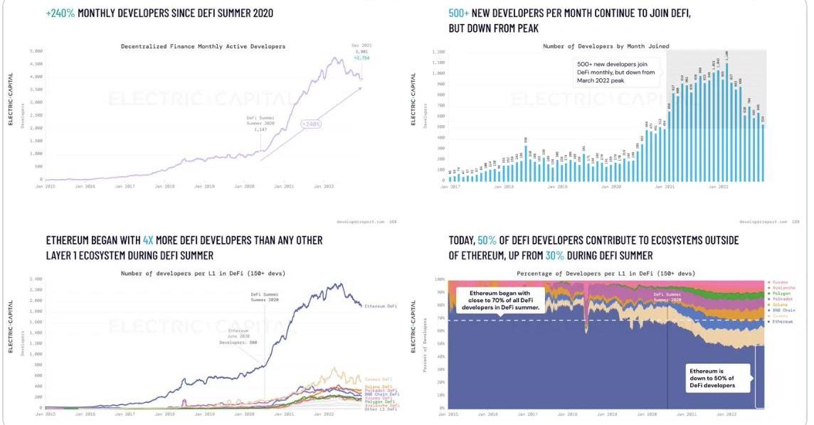 自DeFiSummer以來,DeFi開發人員增加了240%。每月有500名新開發人員加入DeFi。50%的DeFi開發人員在以太坊之外工作。