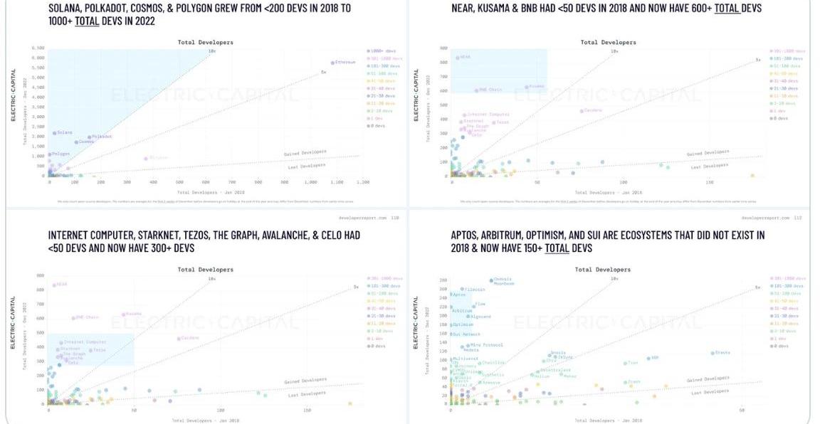 其他生態系統在2018年幾乎不存在,但現在規模相當大,Solana、Near和Polygon的開發人員同比增長40%以上,并且每月開發人員總數超過500人。Sui、Aptos、Starknet,、Mina、Osmosis、Hedera、Optimism和Arbitrum的開發人員同比增長50%。