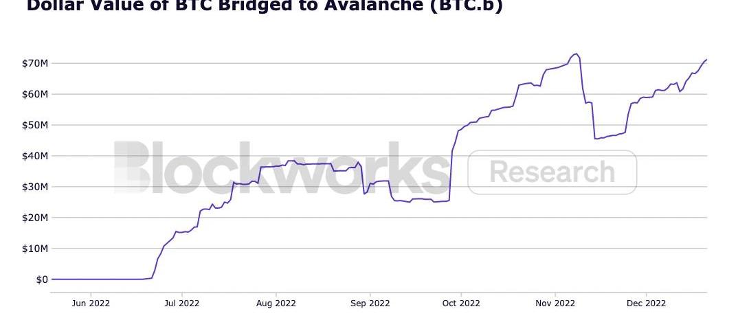 盡管Avalanche的冠軍3AC被曝光為過度杠桿化的欺詐者,但一些開發商仍在繼續發布更新。主要的進步來自于TraderJoe的NFT市場Joepegs及其集中的流動性AMM:流動性賬簿的形式取得了重大進步。如前所述,TraderJoe宣布將部署在Arbitrum的以太坊L2上,盡管該團隊似乎仍將Avalanche視為他們的主要關注點。跨鏈交換網絡THORChain在第四季度完成了對AVAX的集成。加密游戲開發商涌入該生態系統,隨著Shrapnel和Ascenders的顯著發展和發布公告,兩者都朝著全面發布的方向發展。DeFiKingdom和Crabada推出了子網,幫助樹立了項目可以在AvalancheC鏈上發展的榜樣,一旦項目足夠成熟,就可以創建一個自定義子網。Avalanche于10月18日成功實施了Banff升級,這是向稱為AvalancheWarpMessaging的子網到子網通信邁出的一大步。通過子網互操作性,該網絡可能成為Cosmos更重要的競爭對手。Avalanche于6月推出了原生BTC橋BTC.b,該橋在2022年的最后6個月中得到了廣泛采用。