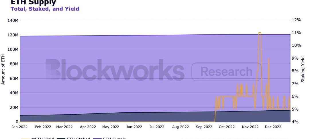 換句話說,在不到四個月的時間內,由于合并,市場上消除了超過15億美元的拋售壓力。此外,PoW網絡下的礦工必須出售一些新開采的代幣來支付運營費用,并且他們不會鎖定鏈的原生資產,因為不需要削減機制來調整激勵。質押的ETH數量繼續以穩定的速度攀升,約13%的總供應量被鎖定在質押合約,收益率約為5-6%。