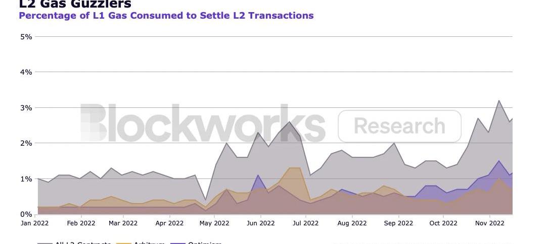 到2022年,隨著不同的生態系統和社區開始形成,以及與以太坊L1相比顯著降低的交易費用,以太坊上的第2層繼續得到更多采用。L2s消耗的以太坊gas總量的百分比在過去一年中穩步增長,其中Optimism和Arbitrum分擔了大部分負載。
