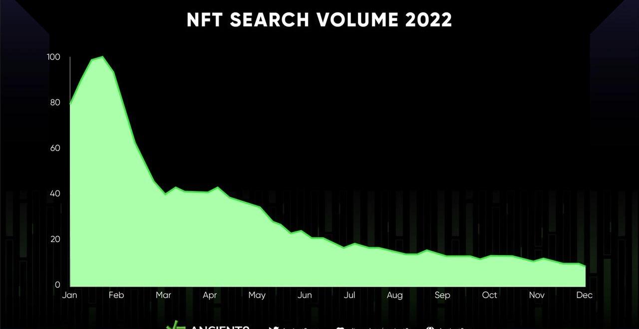 到年底,NFT搜索量已從1月份的峰值下降了約90%,這意味著熊市期間對數字收藏品的興趣有所降溫。NFT的搜索量按1-100的等級評分,100為搜索峰值。搜索趨勢基本與NFT市值大盤的漲跌趨勢一致。