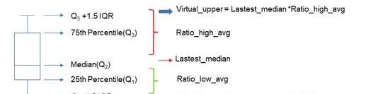 2.根據歷史比值計算最新虛擬上下限值:由上面所求ratio_high_avg/ratio_low_avg及使用最新中位數計算得到虛擬上下限Virtual_upper及Virtual_lower