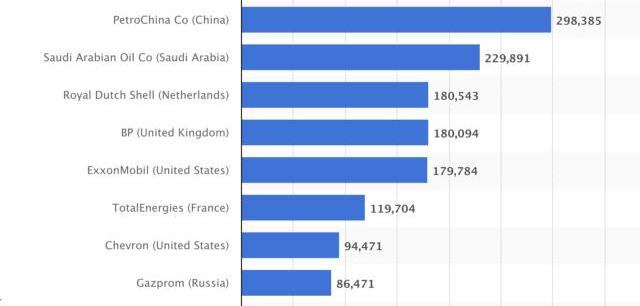 根據國際能源署的數據,全球總能源供應量約為6億兆焦耳。這比能源消耗總量高出約2億兆焦耳。這些能源盈余要么在國家與國家間進行貿易,要么作為儲備以防短缺。2019年疫情的出現使全球能源消耗量減少了4.5%,重要原因在于全球旅行業被叫停以限制病的傳播。但這只是曇花一現,2020年部分國家的出入境恢復正常,能源消耗量又反彈了5%。全球排名前10的能源公司的總市值約為4萬億美元。其中,沙特阿美公司以2.3萬億美元的估值領先,占前10大MC總市值的58%。